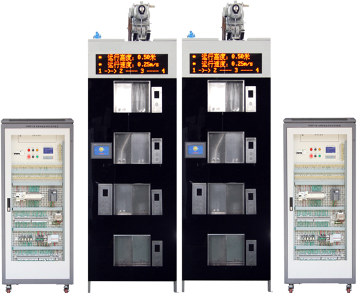 3.設(shè)備為二座四層群控電梯,每部電梯系統(tǒng)均由一臺PLC控制,PLC之間通過485通信模塊交換數(shù)據(jù),電梯外呼統(tǒng)一管理,接近現(xiàn)實中的樓宇電梯控制。學生通過本裝置實訓,不但可以練習單座電梯控制、提高故障的檢測和排除能力,還可以學習電梯群控技術(shù)。