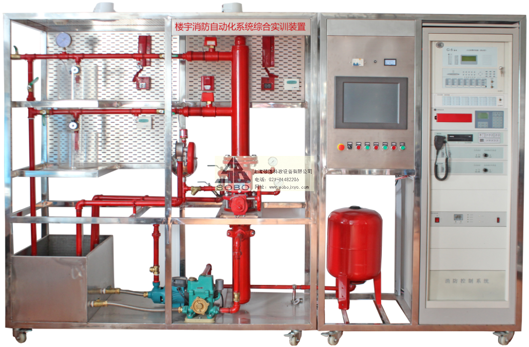 模型框架和水箱等主要部件全部使用不銹鋼器件,保證不生銹、不易老化,模擬兩層大樓噴淋滅火系統(tǒng);模型系統(tǒng)主要由噴淋水泵、氣壓罐、濕式報(bào)警閥、水力警鈴、延時(shí)器、壓力開關(guān)、水流指示器、封閉式噴頭、試驗(yàn)閥、火災(zāi)探測器、火災(zāi)報(bào)警器等典型噴水滅火設(shè)備構(gòu)成,能生動(dòng)模擬大樓內(nèi)水滅火系統(tǒng)的典型結(jié)構(gòu)。