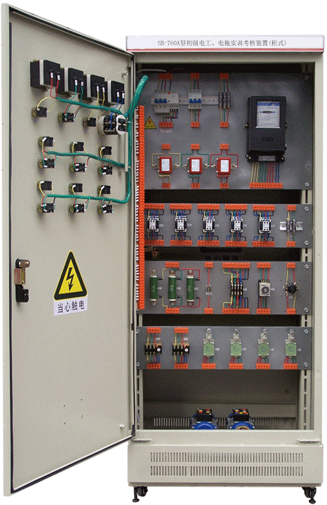 初級電工電拖實訓考核裝置,初級電工考核柜,初級電工實訓考核裝置是按照勞動社會保障部頒發(fā)的“工人技術(shù)等級標準”和“職業(yè)技能鑒定規(guī)范”的內(nèi)容要求,根據(jù)初級電工培訓考核的實際情況而設(shè)計的新一代集培訓學習、理論驗證、實際操作能力、考核鑒定于一體的多功能柜式設(shè)備。整臺設(shè)備以標準的電氣控制柜為主柜,利用柜體的雙面空間,布置電器 及配套實驗器材,能完成初級電工考核鑒定中的電力拖動控制與照明電路的實操項目,該電工、電拖實訓考核裝置堅持理論聯(lián)系實際的原則,突出技能訓練,注重針對性、實用性、科學性,經(jīng)全國多家職業(yè)技能訓練中心、職校、技校使用證明,該柜體設(shè)計合理、實操方便,占地面積少。為延長電器的使用壽命,各電器的接點都與接線端子相連,再讓學生在接線端子上接線,連接電機、電器來完成各項控制實驗,有效降低材料消耗,延長使用壽命。該套設(shè)備適用于各勞動職業(yè)技能鑒定部門,同時適應(yīng)各大、中專、技校、職校初級電工、電拖專業(yè)教學與實訓考核。