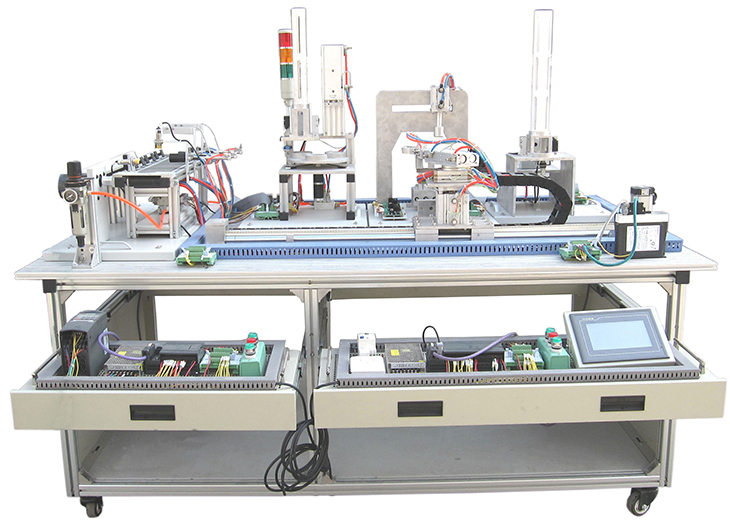 鋁合金導(dǎo)軌式實(shí)訓(xùn)臺(tái):可以安裝送料機(jī)構(gòu)、機(jī)械手、傳輸分揀機(jī)構(gòu)。實(shí)訓(xùn)模塊及PLC主機(jī)等可以放置在拉出式的支架上。