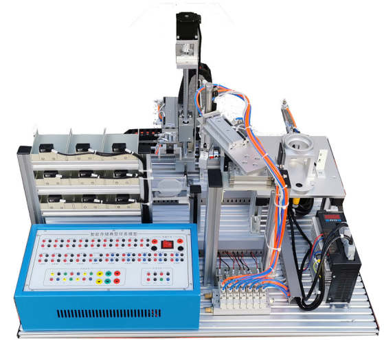 模型底板由10mm厚鋁板加工氧化而成,模型由堆垛機、立體倉庫、搬運機械手、稱重加料機構、傳感器、氣缸等組成;所有機構由有1.2mm優(yōu)質(zhì)鋼板加工噴涂制作或鋁材機加氧化而成,堅固耐用。該任務堆垛機有步進與伺服控制,負責物料的出入倉;機械手負責對物料的加料前后的搬運;稱重加料機構對物料進行稱重及加料工作。同時為方便教學,開發(fā)了全開放的任務接口盒,盒體由1.2mm優(yōu)質(zhì)鋼板加工噴涂制作,面板有鋁板噴涂蝕印沖孔而成,通過并口電纜與智能存儲任務模型連接,以迭插端子形式開放模型接口,方便實訓教學。