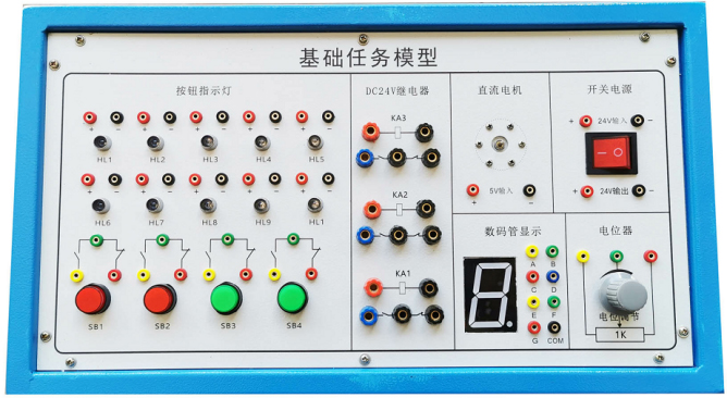 該任務盒有1.2mm優(yōu)質(zhì)鋼板加工噴涂制作,面板有鋁板加工沖孔而成,表面貼膜制作,配置有直流電機、7段數(shù)碼管、彩燈組、繼電器組、按鈕組、電位器等,能滿足對PLC教學基礎任務指令的學習與應用。