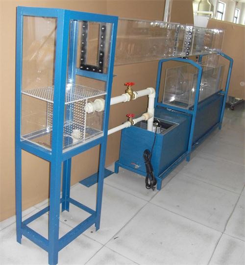 主要配置:實驗工作槽,三角量水堰、回水蓄水槽、供水段穩(wěn)水頭部、多種實驗模型、測量儀器、供水泵、流量調節(jié)裝置等組成,空間三疊層緊縮布置。