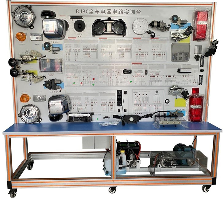 該設(shè)備采用全新BJ80 2.3T整車電器實(shí)物為基礎(chǔ),充分展示汽車發(fā)動(dòng)機(jī)防盜系統(tǒng)、儀表系統(tǒng)、燈光系統(tǒng)、雨刮系統(tǒng)、喇叭系統(tǒng)、點(diǎn)火系統(tǒng)、電動(dòng)車窗系統(tǒng)、電動(dòng)門(mén)鎖、音響系統(tǒng)、起動(dòng)系統(tǒng)和充電系統(tǒng)等汽車電器各系統(tǒng)的組成結(jié)構(gòu)和工作過(guò)程。
