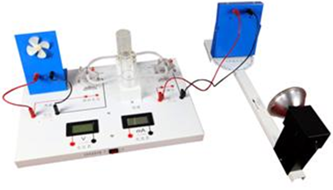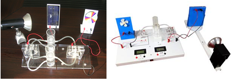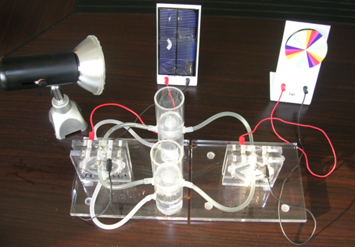 燃料電池教具是利用光線照射在太陽能電池板上產(chǎn)生電能,然后利用產(chǎn)生的電能作用在電解電池模塊上,使水發(fā)生電解產(chǎn)生氫氣和氧氣。氫氣和氧氣進(jìn)入到發(fā)電模塊產(chǎn)生電能,帶動風(fēng)扇轉(zhuǎn)動。