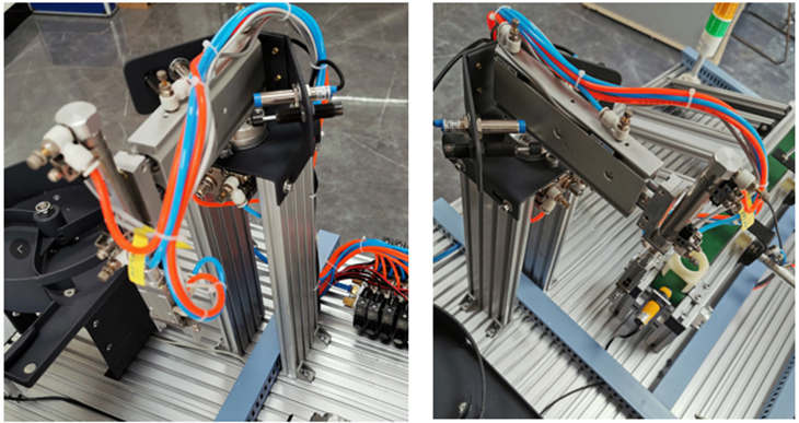 旋轉(zhuǎn)氣缸: 控制機(jī)械手臂的左右轉(zhuǎn),由雙向電控氣閥控制。