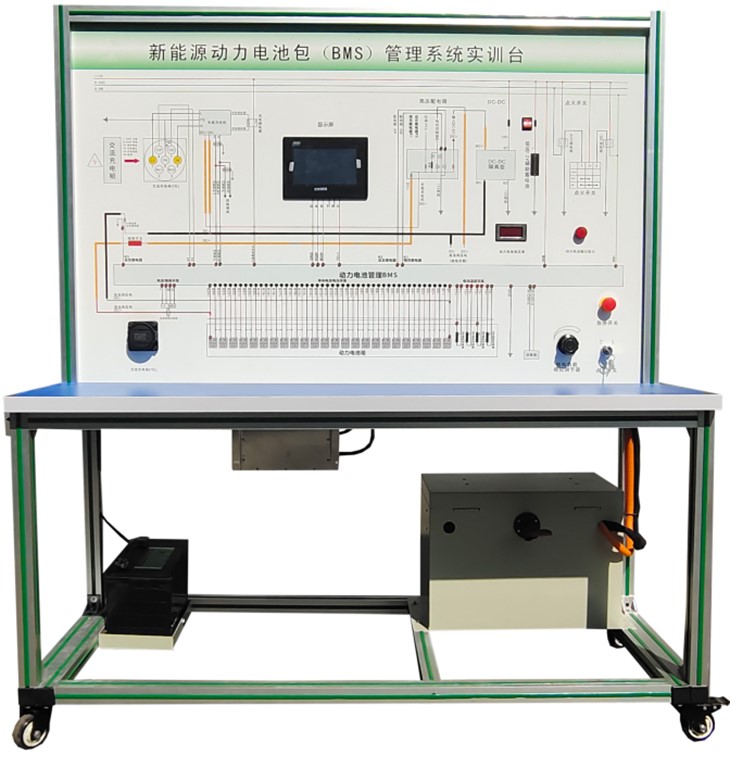 磷酸鐵鋰動力電池包與鐵制電池箱(單體電池3.2V 20AH,24串)、BMS鋰電管理一體機、動力電池包觸摸顯示屏、車載充電機、國標充電插口、國標充電槍、緊急斷電開關、霍爾電流傳感器、直流接觸器(包含充電繼電器、總正繼電器、總負繼電器、預充繼電器)、DC-DC轉(zhuǎn)換器(72V-12V30A)、輔助蓄電池(12V45AH)、放電控制繼電器與放電負載電阻、預充電阻器、可移動實訓臺(1500×700×1700mm 帶自鎖腳輪裝置,帶安裝檢測端子的原理面板,面板1448×940mm)、故障模擬與排除裝置、設備操作說明書。