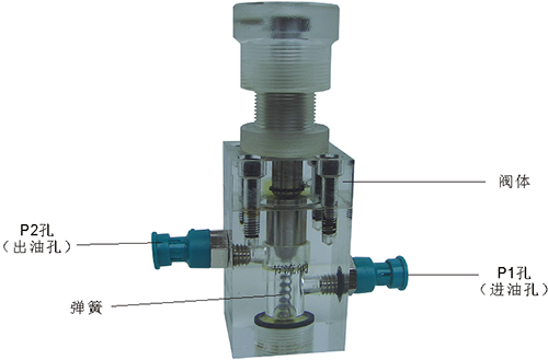 2、液控單向閥結(jié)構(gòu)上參考了國產(chǎn)IY-25B型液壓單向閥,其閥體、螺塞等采用了進(jìn)口透明有機(jī)玻璃材料精制而成,閥芯、頂桿采用了45#中碳鋼材料,并配合彈簧,油接頭,密封圈等標(biāo)準(zhǔn)件裝配而成,通過它可明確地觀察到活塞、彈簧、油孔等結(jié)構(gòu)及其運(yùn)行過程,具有形象逼真,性能可靠等優(yōu)點(diǎn)。它即可作為教學(xué)模型,也可以作為液壓實驗元件進(jìn)行實驗演示。