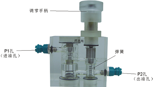 2、溢流閥結(jié)構(gòu)上參考了國產(chǎn)P-63B型低壓直動式溢流閥,其閥體閥蓋、鎖緊螺母、調(diào)節(jié)螺母、螺塞等采用了進(jìn)口透明有機(jī)玻璃材料精制而成,閥芯、調(diào)節(jié)桿采用了45#中碳鋼材料。并配合彈簧,油接頭,密封圈等標(biāo)準(zhǔn)件裝配而成,通過它可明確地觀察到閥芯、彈簧、油孔等結(jié)構(gòu)及其運(yùn)行過程,具有形象逼真,性能可靠等優(yōu)點(diǎn)。它即可作為教學(xué)模型,也可以作為液壓實驗元件進(jìn)行實驗演示。